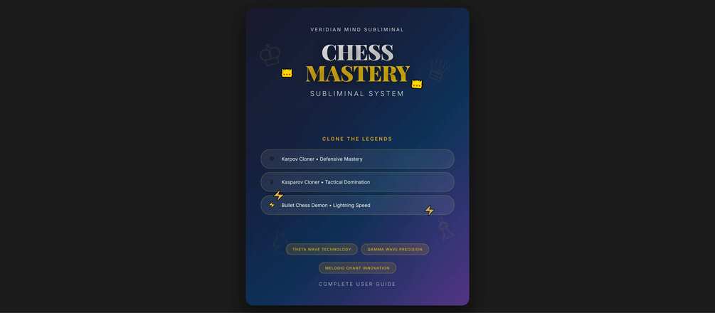 Unlock elite chess intuition with this breakthrough subliminal bundle—program your subconscious to channel Karpov's positional fortress, Kasparov's tactical storm, or become a bullet chess demon. No endless training; just listen and watch your game transform through melodic chants, theta waves, and gamma precision.